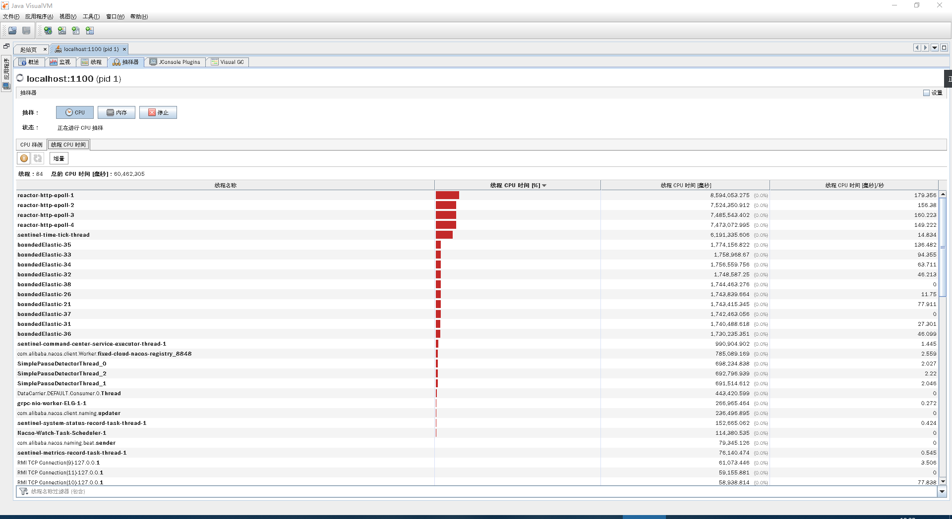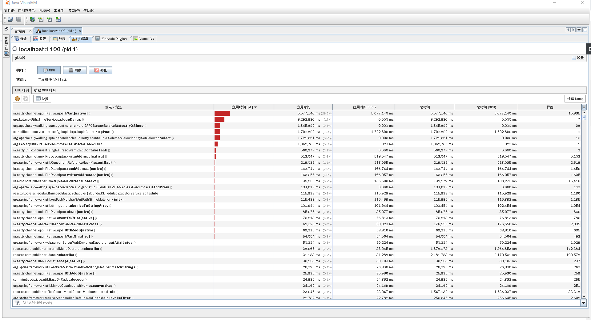 我们再持续看一会儿Gateway服务中的线程所消耗的时间比例,看一下方法级的时间消耗有没有异常的情况,也就是比例非常高的,如下图所示: