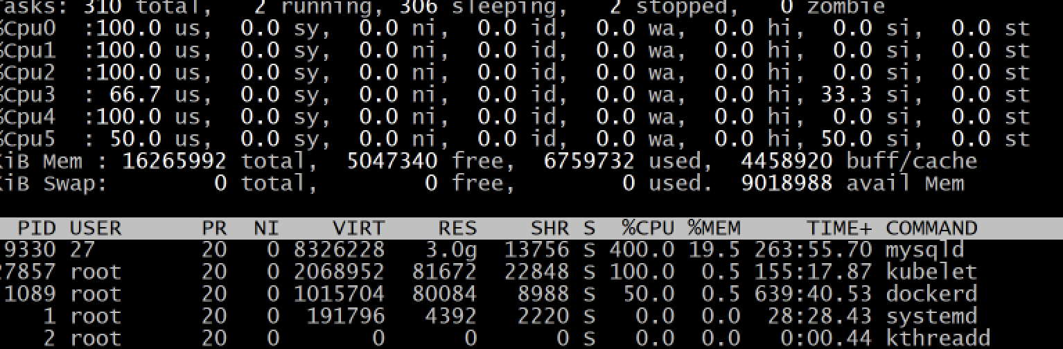 1095 root 20 0 998512 86168 13100 S 6.5 0.5 837:37.56 /usr/bin/dockerd -H fd:// --containerd=/run/containerd/containerd.sock